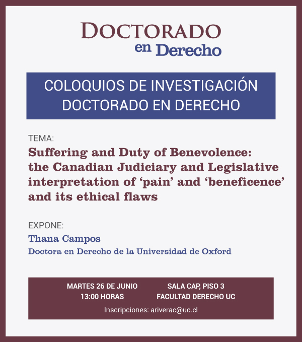 Coloquios de Investigación Doctorado en Derecho: Suffering and Duty of Benevolence. The canadian Judiciary and Legislative interpretation of ‘pain’ and ‘beneficence’ and its ethical flaws